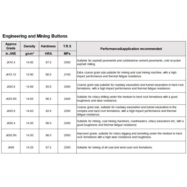 The carbide button is sintered by coarse-grained cemented carbide, with a property of high hardness and good transverse-rupture strength, and corrosion resistance, resistance to acid and alkali, long service life.